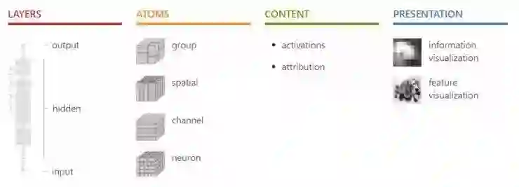 每个元素使用特定的呈现风格(例如,特征可视化或传统信息可视化)来显示特定类型的内容(例如,激活或归因)。该内容存在于由网络给定层如何分解为原子而定义的底层上,并且可以通过一系列操作(例如,将其过滤或将其投影到另一底层上)进行转换。例如,我们的语义词典使用特征可视化来显示隐藏层神经元的激活。