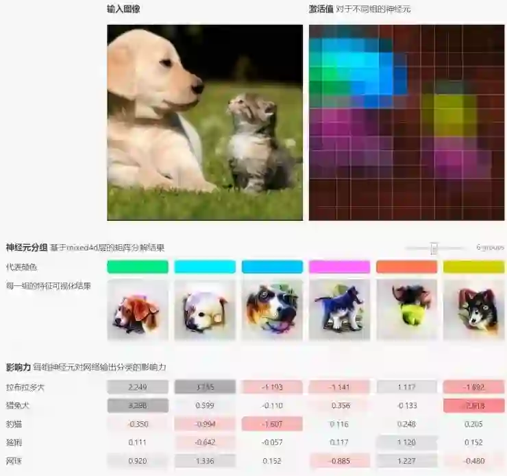 通过非负的矩阵分解,作者们把总数目很大的神经元分为一个个小组,让它们简明地总结出整个网络的运行状况。右图小方块的不同颜色对应了下方不同的特征分别占不同空间的激活值的主要成分