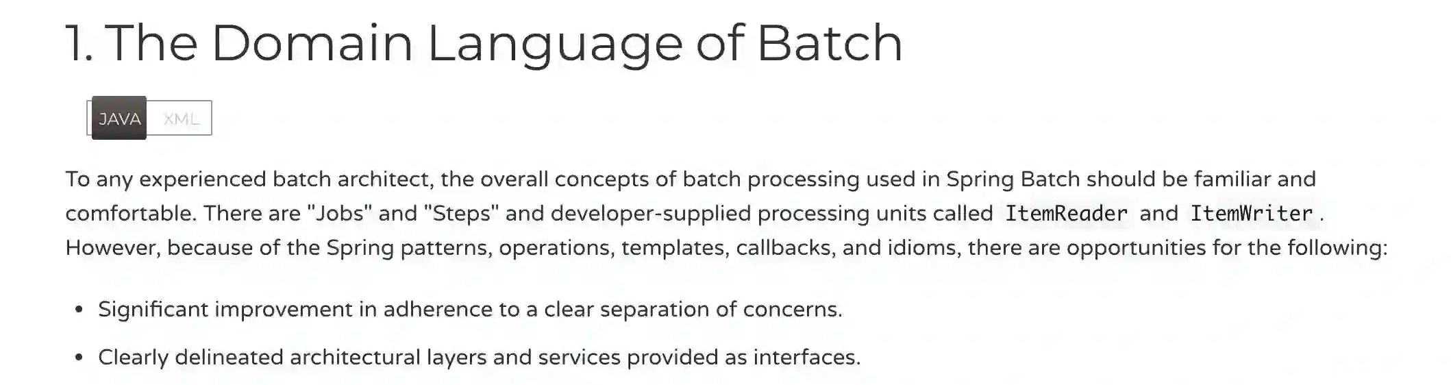 Spring Batch 的文档多年来一直没有经过大的修改。但在这个版本中,文档已经被移植到 Asciidoc 中,以简化文档的创建,并且在整个 Spring 组合中保持一致。 除此之外,参考文档现在可以选择使用每页顶部的切换选项查看 Java 配置或 XML 配置中的所有示例。