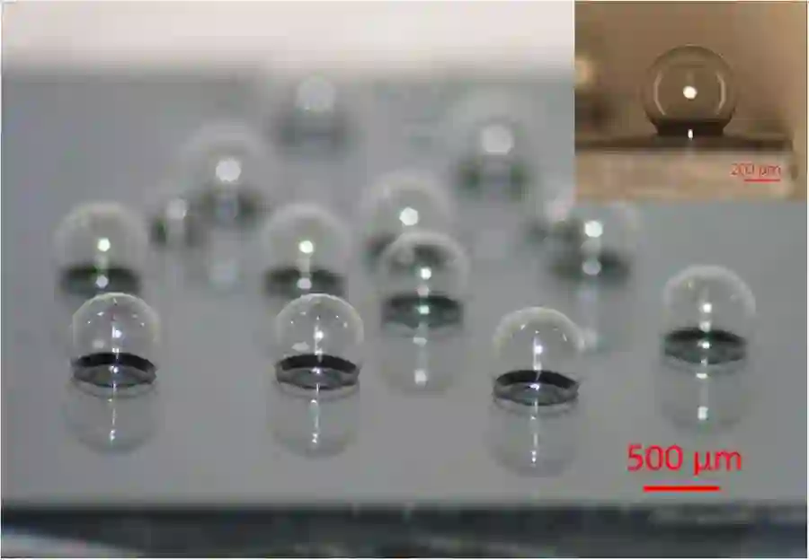 这种空心硼硅酸盐玻璃是通过被蚀刻到硅衬底中的、密封加压的圆柱形空腔膨胀而成。使用玻璃吹制技术,这种薄的玻璃晶片,可在高温和外部真空压力下,形成几乎完美的泡泡。研究人员让这一组球的直径从230微米生长到1.2毫米,壁的厚度从300纳米生长到10微米。