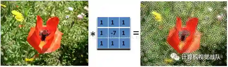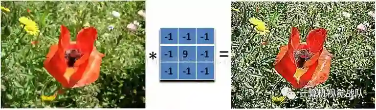 这两者操作统一起来就是锐化滤波器了,也就是在边缘检测滤波器的基础上,再在中心的位置加1,这样滤波后的图像就会和原始的图像具有同样的亮度了,但是会更加锐利,如下: