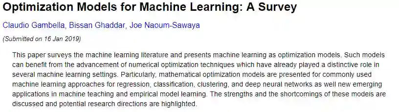 【摘要】本文对机器学习文献进行了调查,并将机器学习作为优化模型。 受益于数值优化技术的进步,机器学习的性能随之提高。特别地,这篇文章针对回归,分类,聚类和深度神经网络的常用机器学习方法以及机器教学和经验模型学习中的新兴应用,提出了数学优化模型。 讨论了这些模型的优点和缺点,并强调了潜在的研究方向。
