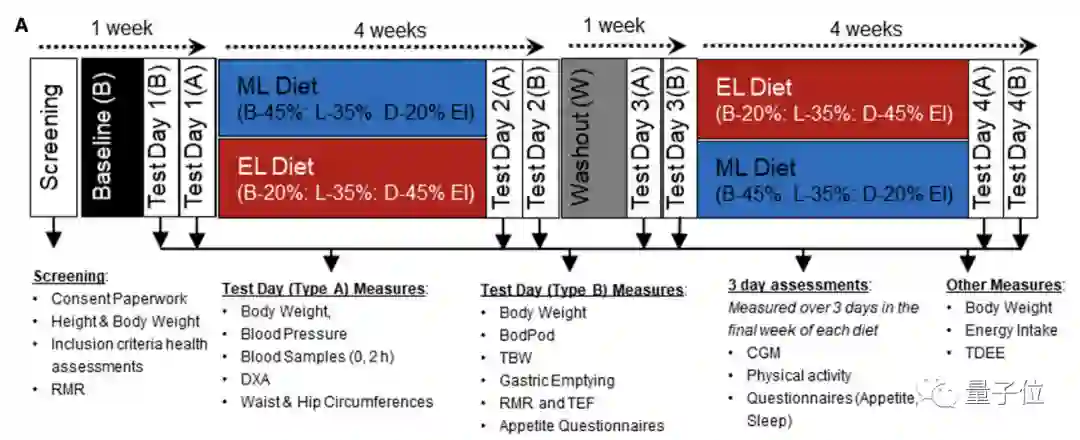 具体到执行,受试者们被随机分配为两组,两组每天进食的总热量是一致的,但早中晚饭的比例不同。