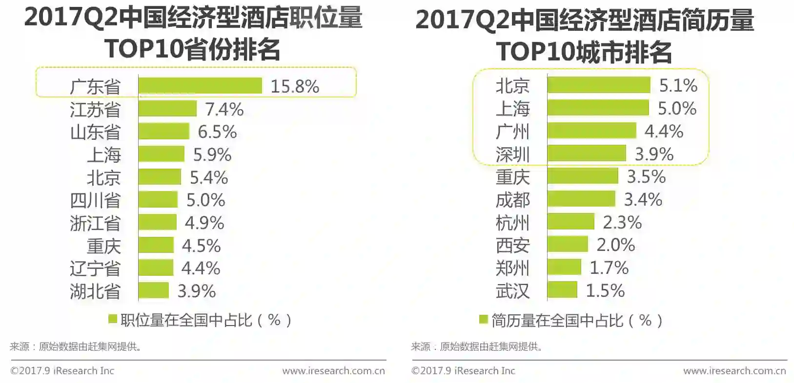 2. 2017Q2在全国省份中,广东省职位量占比领先全国,而在全国各城市中,北京简历总量以微弱优势领先上海。