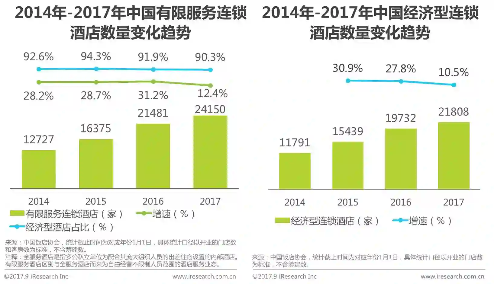 截止至2017年1月1日中国有限服务连锁酒店门店数量达到24150家,相较于2016年1月1日仅增长12.4%,增速大幅降低。在全国有限服务连锁酒店中,2017年经济型酒店门店数为21808家占比90.3%,相较去年略有降低,仍为中国连锁酒店主要构成者。