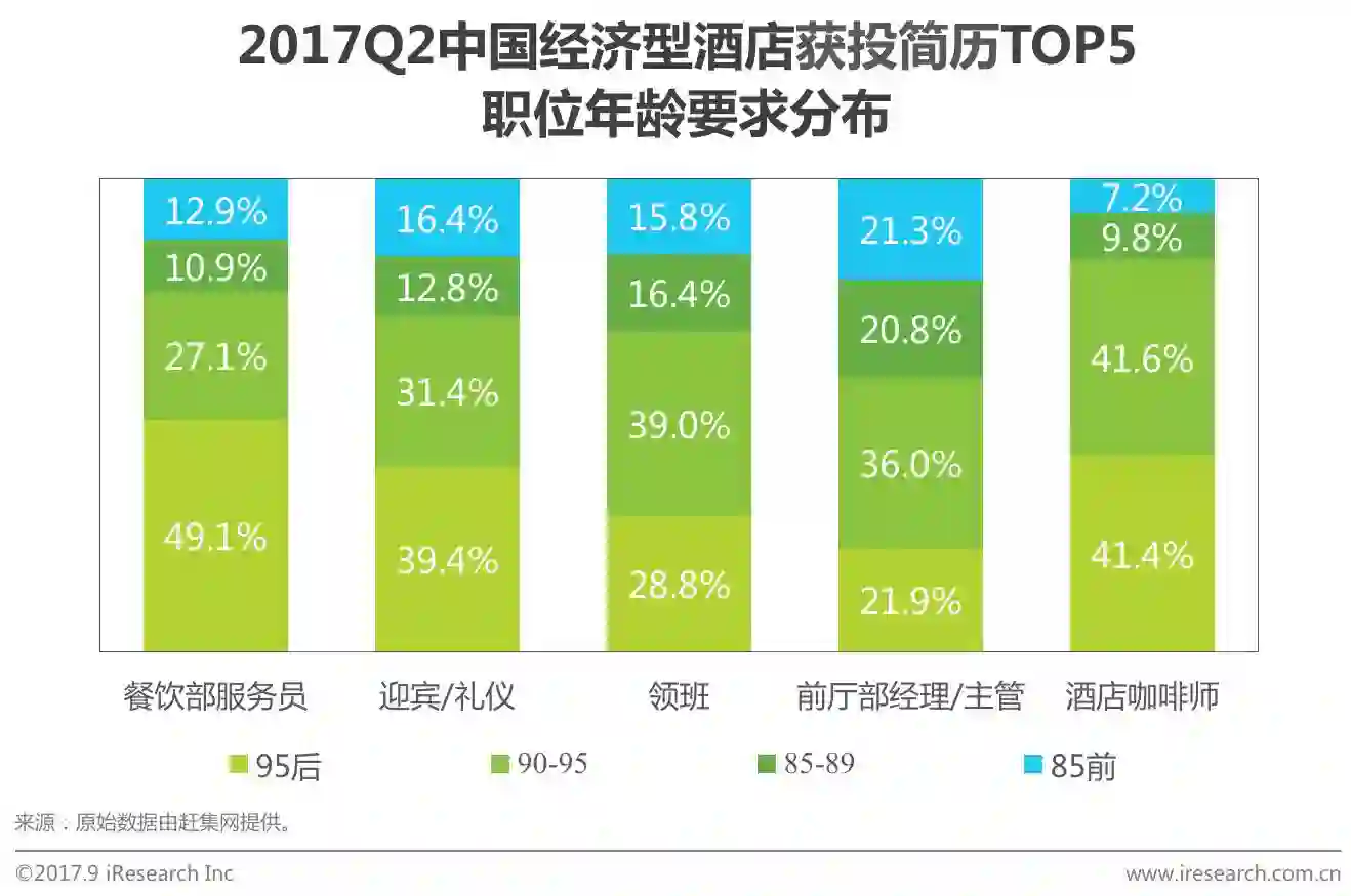 根据赶集网历史数据,2017Q2中国经济型酒店人才市场需求端对出生年份的要求情况为“95后”0.3%、“90年-95年”9.9%、“85年-89年”53.3%、“85前”32.7%和“不限制年龄”为3.8%,而求职人员的出生年份分别为“95后”50.9%、“90年-95年”29.4%、“85年-89年”11.0%和“85前”8.7%。整体对比来看,中国经济型酒店人才供给相较需求端更加偏向年轻化。