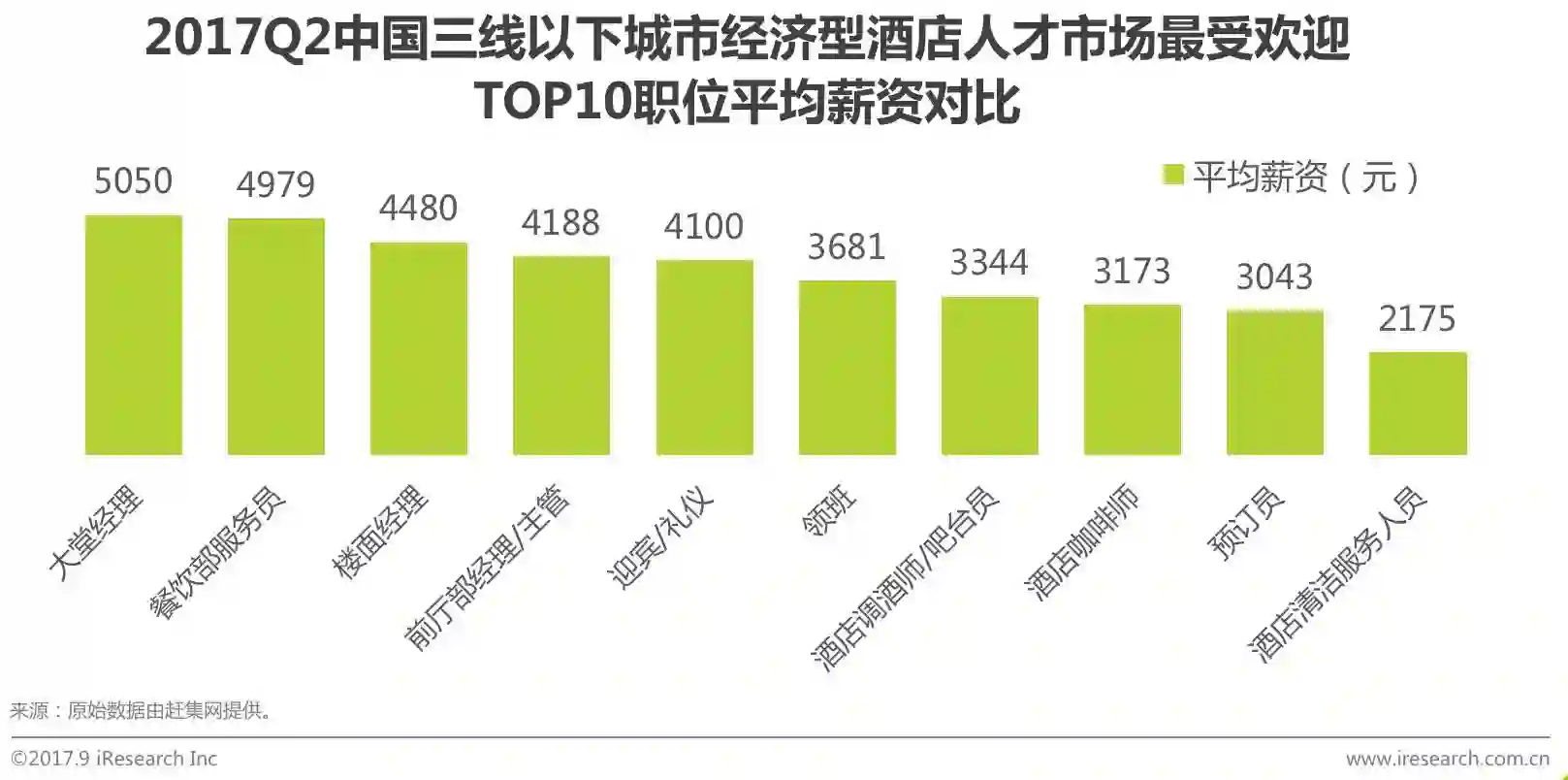 根据赶集网历史数据,2017Q2在三线以下城市经济型酒店人才市场中,以投递简历量最多的TOP10职位进行横向比较,平均薪资最高的职位是大堂经理,其次是餐饮部服务员,再次是楼面经理,平均薪资依次为5050元、4979元和4480元。由于三线以下城市基础劳动力较为丰富,所以平均薪资较高的职位主要集中在管理类职位。