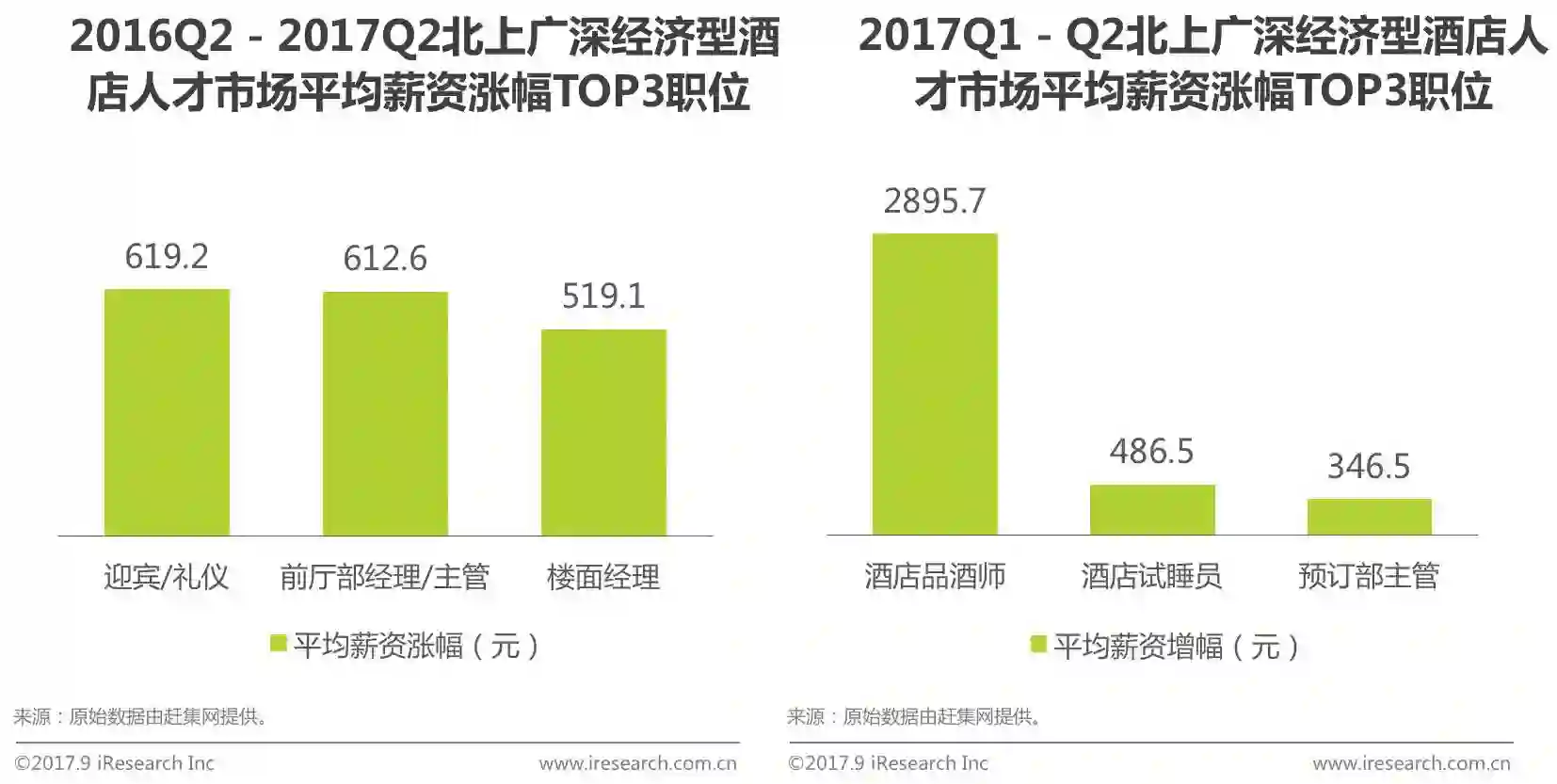 根据赶集网历史数据,在北上广深一线城市中,2017Q2相较2016Q2平均薪资增长排名第一的是迎宾/礼仪,其次是前厅部经理/主管,再次是楼面经理,平均薪资涨幅依次是619.2元、612.6元和519.1元。而2017Q2的各职位的季度环比增长则差幅较大,其中酒店品酒师平均薪资涨幅为2895.7元,而其余平均薪资TOP3职位则分别为,酒店试睡员涨幅486.5元和预订部主管346.5元。