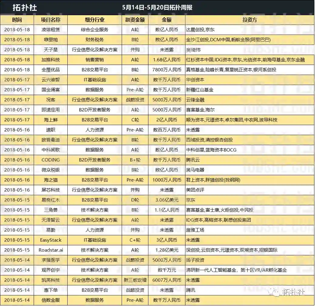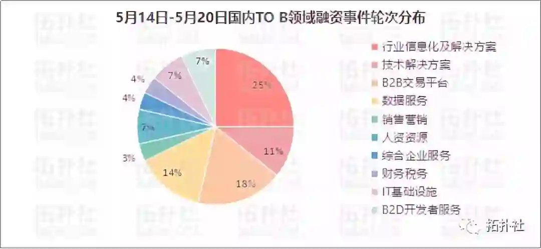 在 5 月 14 日-5 月 20 日这一周里,拓扑社总共追踪到 to B 领域 28 起投资并购事件,披露金额累计约 45.54 亿元人民币。
