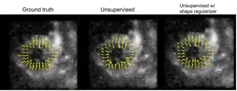 图5)上:心脏运动跟踪+分割联合建模的四维两通道CNN架构; 下:左=位移场;右=左心内膜(红色)和心外膜(绿色)的轮廓线。