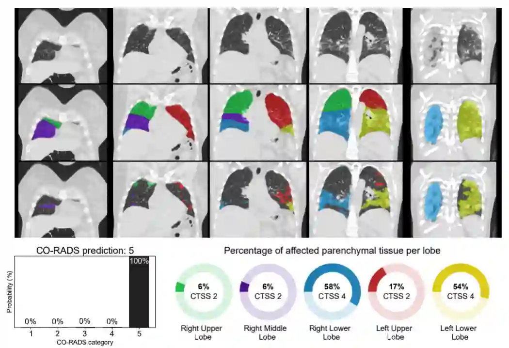 图3)CORADS-AI系统示例。第一排显示冠状切面,第二排显示肺叶分割,下排显示检测到的异常区域和典型的COVID-19感染。图像下方显示每个肺叶的CO-RADS预测和严重程度评分。