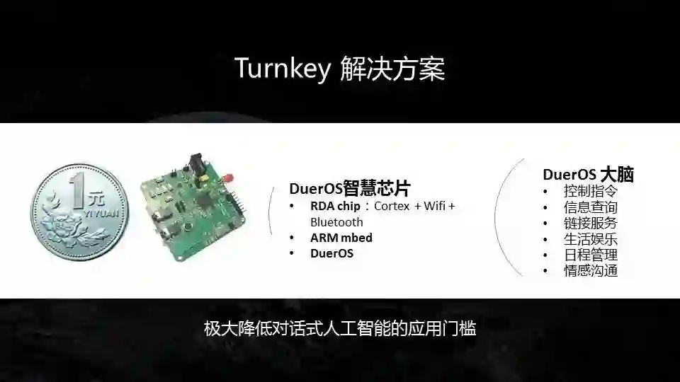 3月30日,我们会与ARM和RDA一起发布DuerOS智能芯片,我们会把基础的语音能力集成到很多设备里面,搭建一个平台让合作伙伴在这上面做相应的对话式人工智能工作。同样,我们也希望能赋予更多合作伙伴更多的可能。