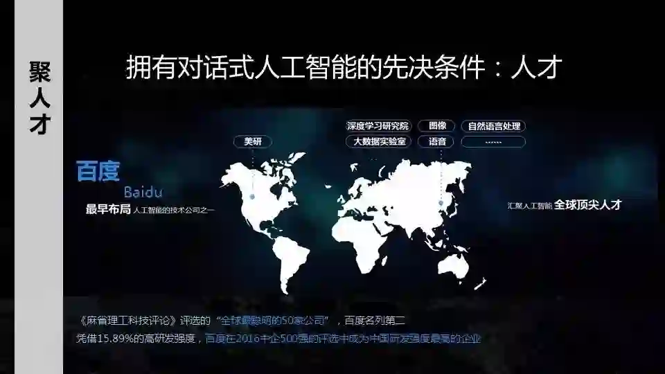 2. 人工智能人才现在非常昂贵,同时现在的人才也不是很多。我们需要抓住最top的人才,这些人主要分布在中国和美国。从百度的角度,人工智能相对top的人才都已经聚集在百度,从中国到美国。