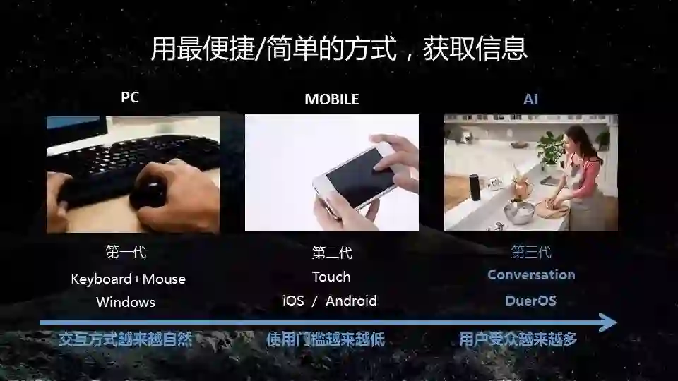 我们看整个科技的发展,每一个时代,从PC时代到无线时代到AI时代,人类都在用不同的方式与机器进行沟通。例如第一代我们用鼠标、键盘产生的机器语言与计算机进行沟通,代表的操作系统是 Windows;第二代我们用手指与机器进行互动,代表的操作系统是iOS和安卓;第三代是人工智能操作系统,我们希望用户以对话的方式与设备进行沟通。