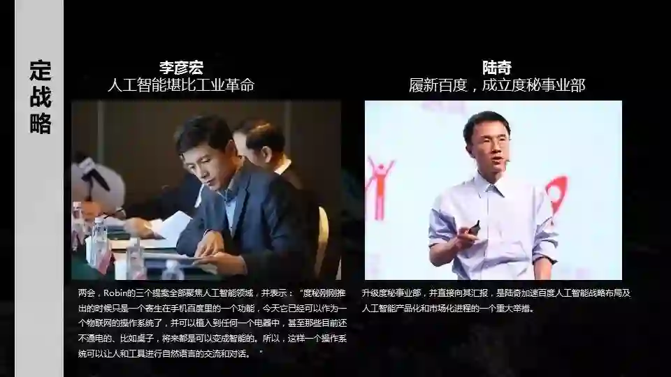一是定战略。这个事情很容易被忽略,我们看一个公司在人工智能上是否真的投入,应该看组织架构,组织架构是最影响人工智能执行效率的。你看百度的组织架构,再看其他人工智能公司的组织架构。如果是一家创业公司,创业公司的组织架构很清晰,all in AI;如果是一家大公司,一定要判断它是不是把人工智能作为一项业务来发展。只有作为一项业务发展,而且是一个独立事业部时,组织效率才会最高。随着陆奇加入百度,我们成立了独立的度秘事业部来开展人工智能。