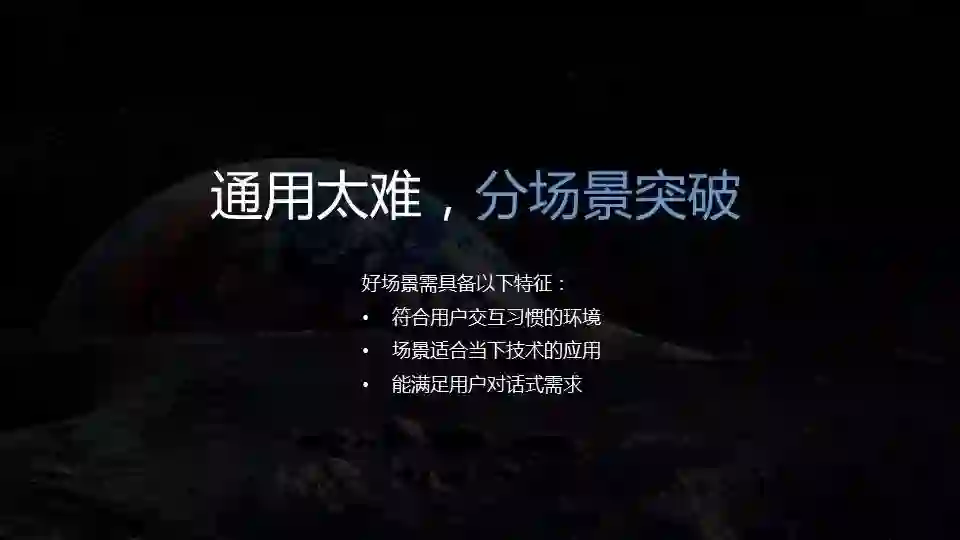 好的场景有几个特点:第一、它是要符合用户交互习惯——如果用户在这个场景上已经养成键盘或触摸式的交互习惯,其实很难改变用户场景;第二、场景需要适合当下技术的应用,只有技术成熟,才能做出比较好的产品;第三、对话式人工智能要满足用户对话式的需求。