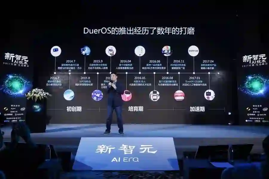 今年1月份,我们在美国拉斯维加斯正式推出了DuerOS对话式人工智能操作系统。对话式操作系统的演进是一个漫长的过程,需要储备比较长的时间。我们大概在2014年7月份正式推出了对话式人工智能助理,到2015年首次发布,这是我定义的第一个时期,初创期。