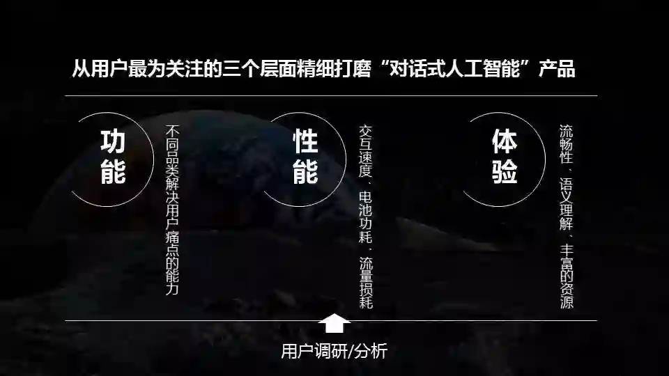 还有一个观点是,在对话式人工智能推进的过程中技术是基础,最关键的是端到端的用户需求满足。很多人并不需要语音识别,他们需要端到端的需求满足,比如是否能够播音乐,查天气,查股票价格,这才是用户真正关心的。所以,就对话式人工智能产品而言,功能性、性能、体验都是用户端到端一体的需求。
