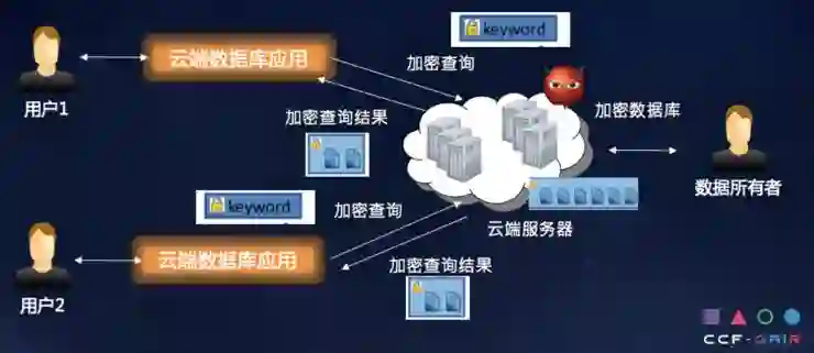 比如怎么利用云端数据的机密框架,当用户把数据外包到云上,这个云跟它不在一个信任域里面,所以希望对数据库加密起来,如此一来不论云是主动还是被动的,用户想看到数据就是密文。