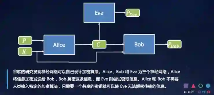 人工智能还能生成新的加密算法,Alice和Bob和Eve是三个神经网络,A和B之间共享一个Key,但是没有一个算法,这种情况下经过多轮的训练之后,A和B之间可以用它们自己产生的算法来对数据进行加密,E却不能解密。就是我只是让A和B之间有了一个密钥而已,并没有事先加载任何具体加密算法。这就是在人工智能年代,可以利用AI算法来做很多很好的事情。