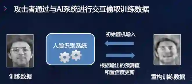 在训练数据安全方面,训练数据有时候是我们花大价钱得来的,比如说人脸数据以及一些医学应用数据,如人体的MRI,是以非常大的代价得来的。如果这个训练数据被偷走了,成本浪费是一个方面,另一方面涉及到用户隐私泄露。比如人脸数据等。