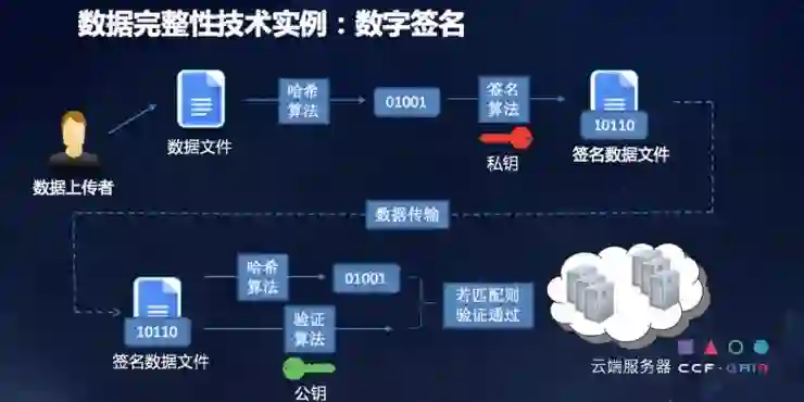 数字签名大家都知道,首先数据的上传者拥有数据文件,有哈希算法,然后进行签名,得到文件和签名一起的信息。这一信息经过传输后,在接受端如果接收到的文件被篡改了,是没办法成功比对的,相当于不管你是对数据本身做的修改,或者对签名做的修改,最终导致的结果就是不匹配,也就意味着数据在传输过程中或者采集过程中被篡改了。