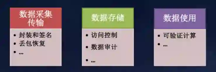 数据完整性需求存在于数据采集传输、数据存储和数据使用等多个阶段。在数据采集和传输阶段,可以用数据分装和签名技术防止数据篡改;传输时候有一些丢包恢复的机制,即便有一些包被丢掉了,不用同传也可以有本地数据、数据审计;在数据使用的时候怎么保证完整性,可验证计算等等手段来进行保护。