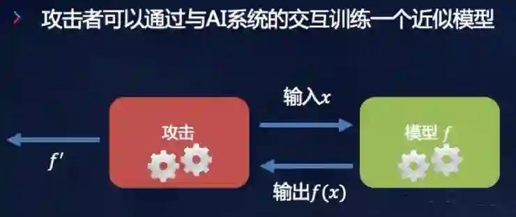 模型参数安全,攻击者可以与AI系统进行交互,这个模型如果是线性模型的话,就把它的参数求到,如果是非线性的话,利用梯度学习重新获得近似的学习,可以得到99%的准确率,跟原先训练好的模型,可以把参数给拿到。