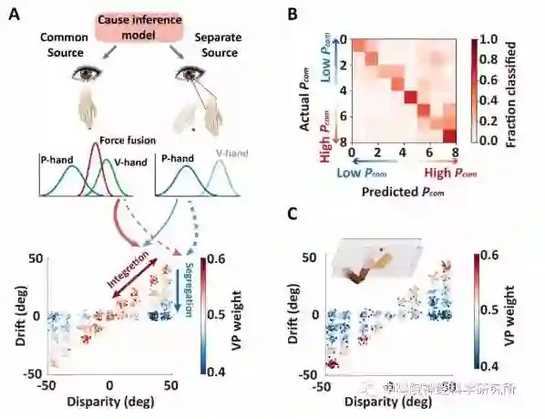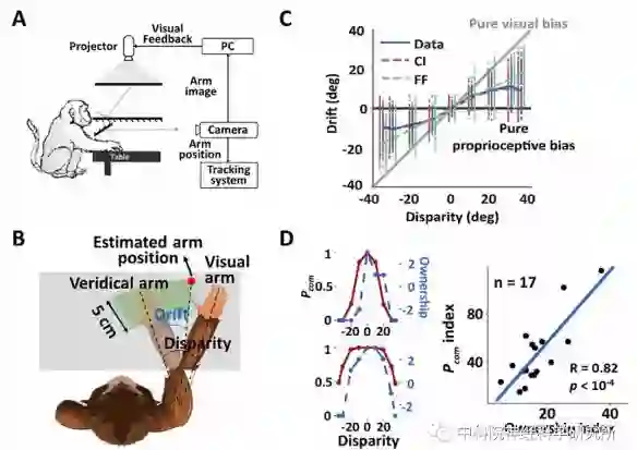 为了进一步定量的描述手臂拥有感与本体感觉偏移以及视觉-本体感觉信号输入之间的关系,研究人员利用贝叶斯因果推理模型对人和猕猴的行为结果进行了拟合(图1D)。该模型认为当视觉-本体感觉信息的空间位置越接近,大脑认为两者来自同一来源(common source)的概率越高,从而有更高的概率认为视觉手臂和本体感觉手臂两个信息来自同一来源,那就自我的身体(图2A)。拟合结果显示,人和猕猴对手臂视觉-本体感觉信息的整合都符合贝叶斯因果推断理论,并且模型所预测的视觉-本体感觉来自同一来源的后验概率(Pcom)与人类被试通过问卷汇报的身体拥有感打分存在显著的相关性。这些结果第一次发现,通过客观的行为学指标可以定量地测量猕猴对手臂的主观拥有感。