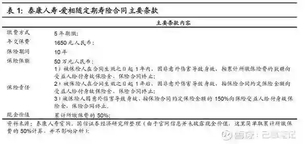 保险公司与保护通过签订保险合同的形式,约定双方的权责,本质上是对双方未来现金流做出的条件限定。下面以泰康人寿的一款产品为例: