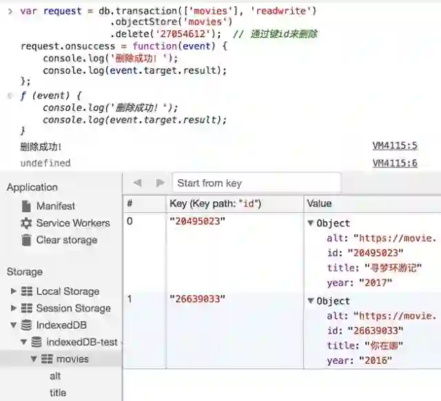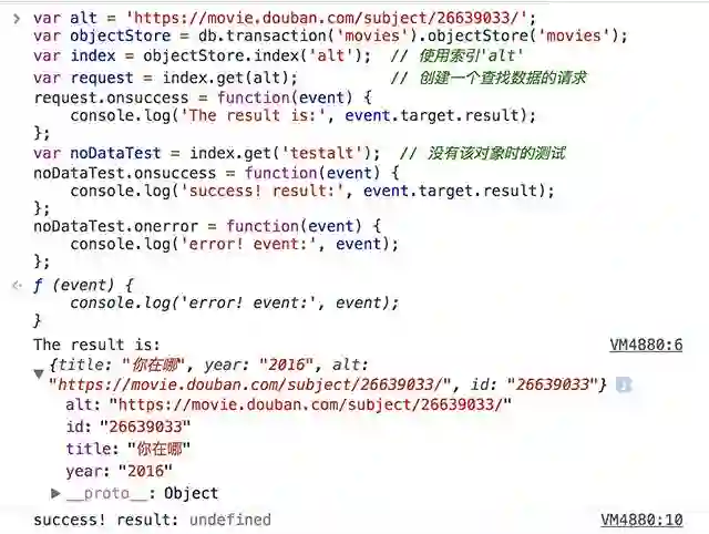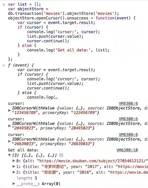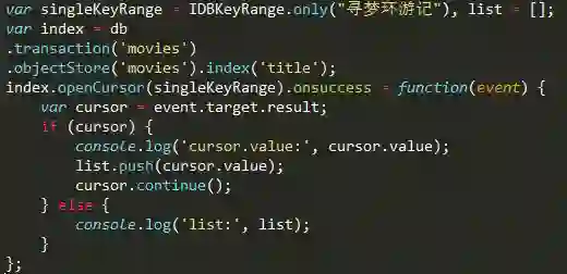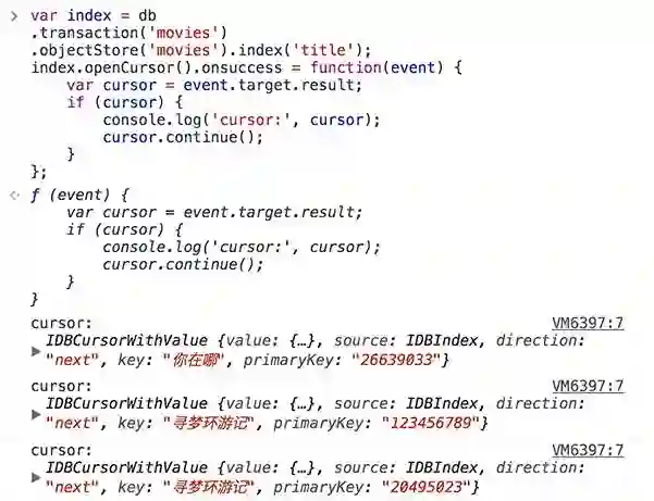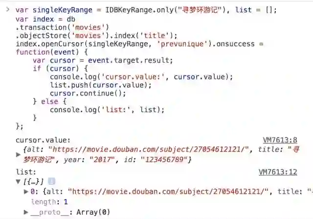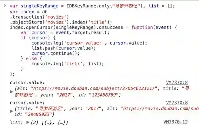 使用一次索引,我们只能得到一条数据; 如果我们需要得到所有title属性值为寻梦环游记的对象,我们可以使用游标.