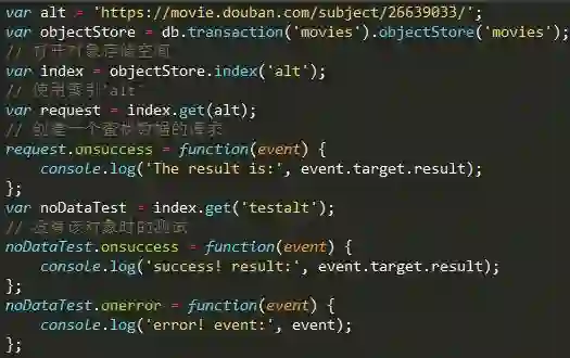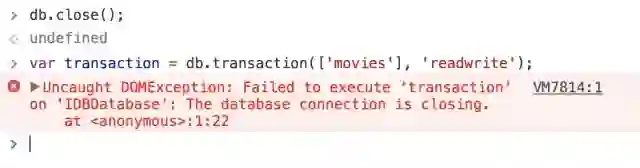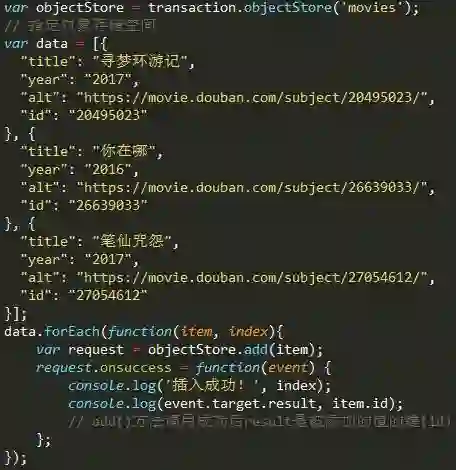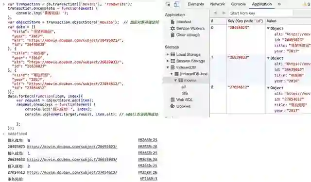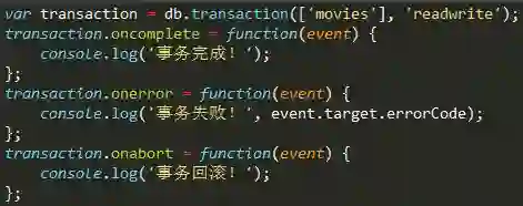 这样,我们得到一个事务对象transaction, 有三种事件可能会被触发: complete, error, abort. 现在,我们通过事务向数据库indexedDB-test的 对象存储空间movies中插入数据: