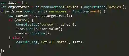 若未取完,则result是个IDBCursorWithValue对象,需调用continue()方法继续取数据。 也可以根据自己需求, 对数据进行过滤。