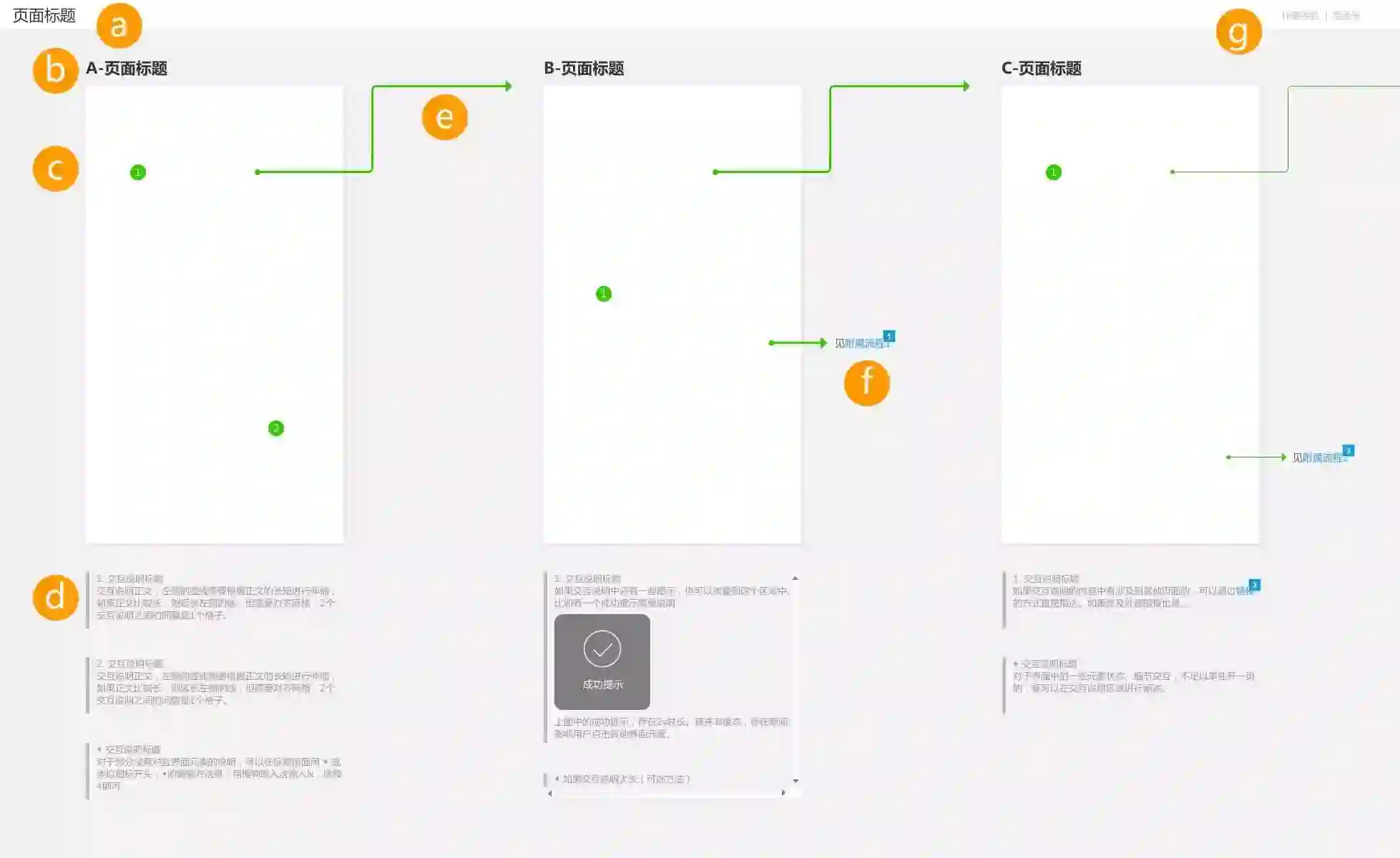 接近界面:因为设计说明是针对界面的解释,所以不能离界面太远,不然很难对着界面看说明。如果设计说明实在太多,可以采用动态面板的方式承载(交互稿模板附件中有示范);