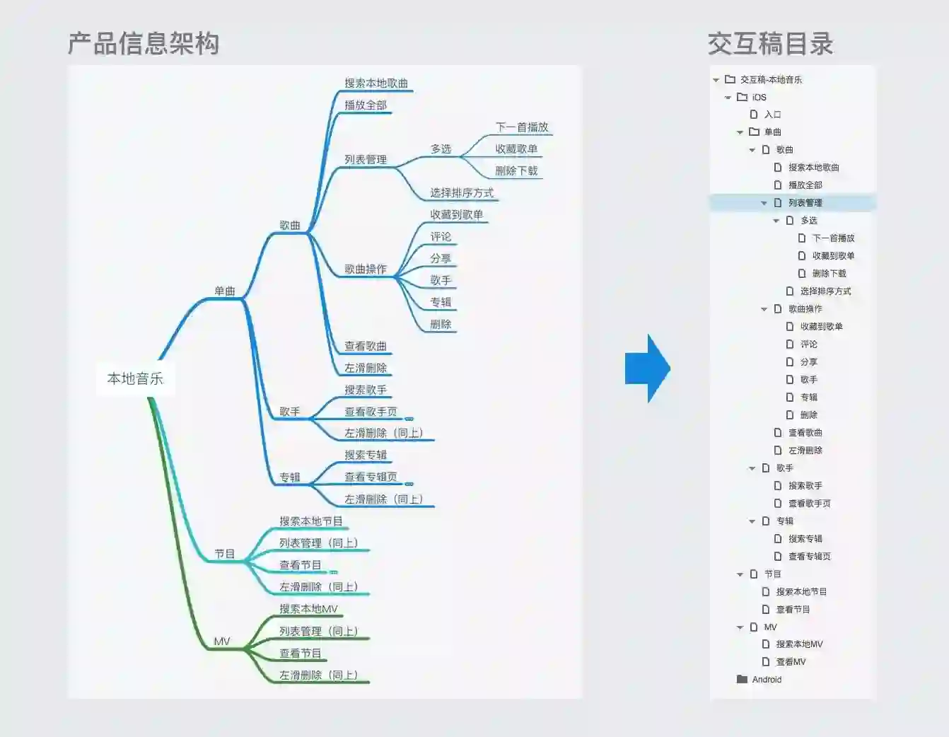 比如下图是网易云音乐“本地音乐”模块的信息架构和交互稿目录,由产品信息架构可以推导出交互稿目录。