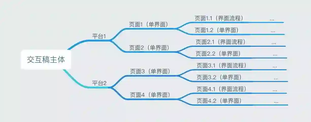交互稿结构应当遵循“平台–页面–子页面”这样的原则(下图,这里说的页面不是界面,而是指“一页交互稿”)。每一个页面中承载的对象有2种,一种是单界面,另一种是界面流程(后文解释)。