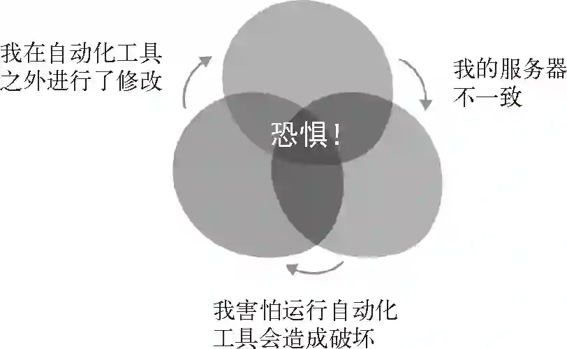 这就是自动化恐惧恶性循环,如图 1-1 所示。基础设施团队需要打破这种恶性循环,才能成功实施自动化。最有效的方式是直面恐惧。挑选一组服务器,调整配置定义,确保它们可以工作,并安排它们至少每小时以无人值守的方式运行一次。然后,挑选另一组服务器并重复这个过程,直到所有的服务器都持续更新。