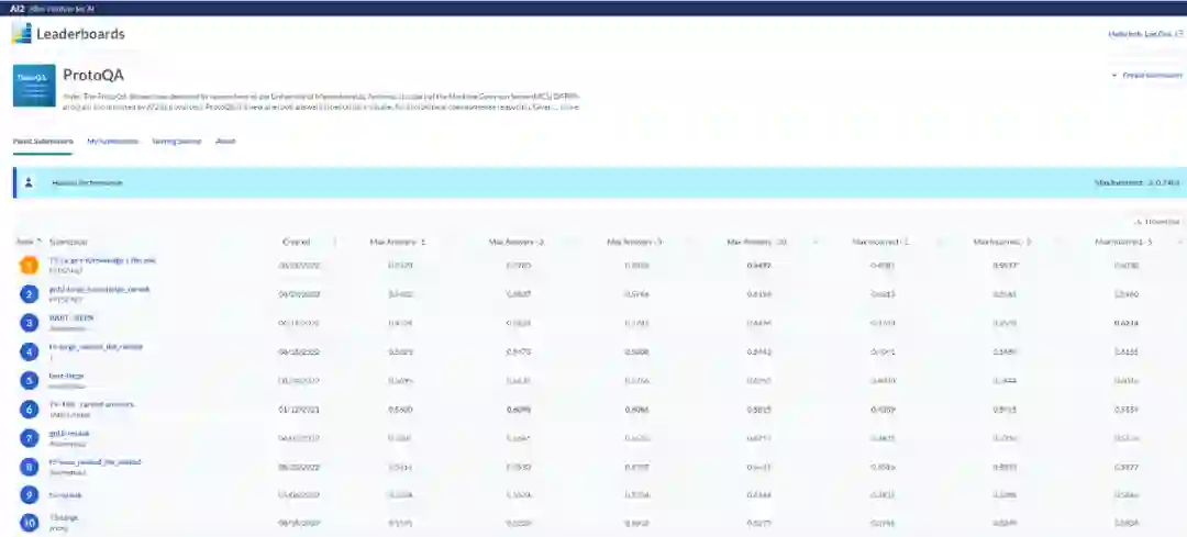 哈工大深圳 HLT 研究组于 2022 年 8 月 24 日获得 AI2 Leaderboards 中 ProtoQA 榜首。而后另一模型再次刷新榜首的记录。目前霸榜前两名。榜上第三和第六名分别被匿名团队和 Team Cosmic 获得。此外,还有 CMU/Bosch/USC,UMass Amherst,MOWGLI / USC INK Lab,USC LUKA,MOWGLI / USC LUKA,MOWGLI / Stanford 等团队参加(以上为非匿名团队)。