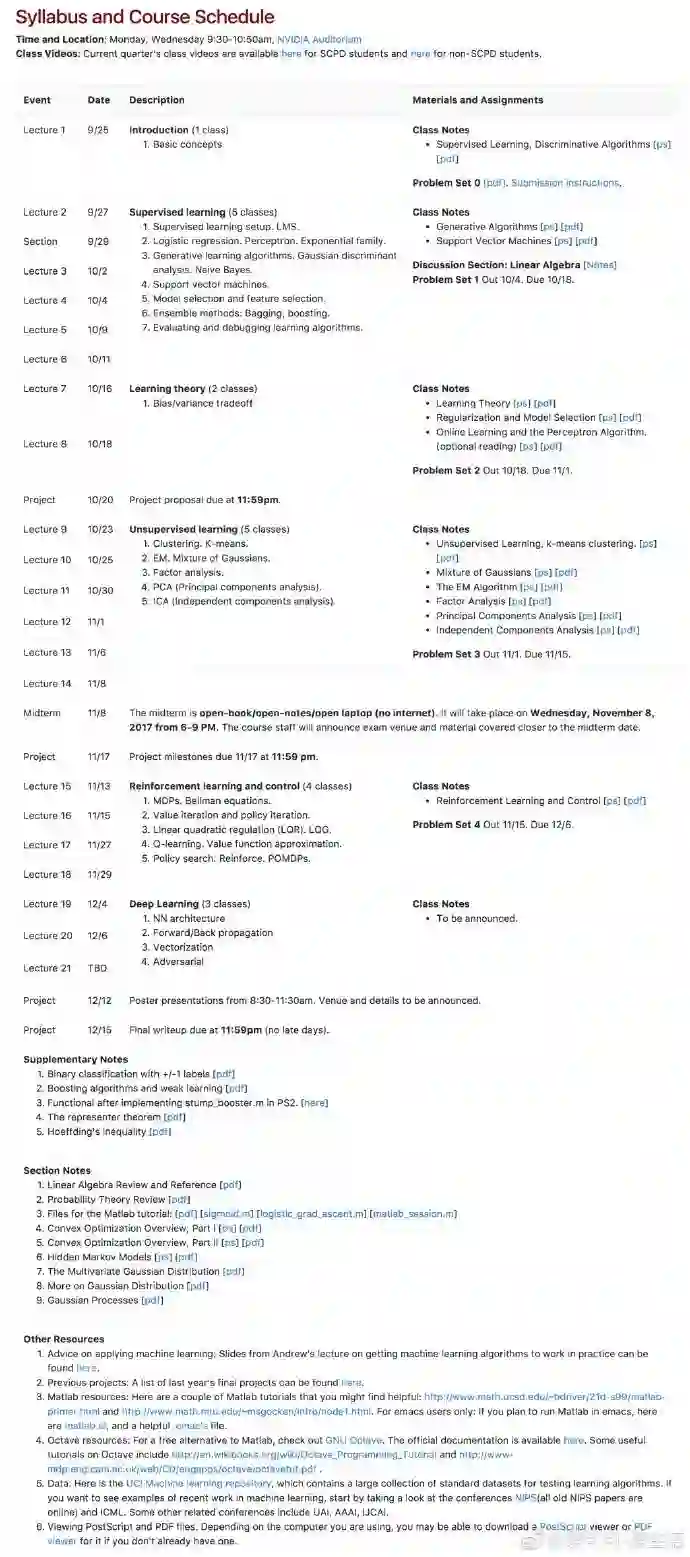 附:斯坦福CS229机器学习课程(2017)课程排期: