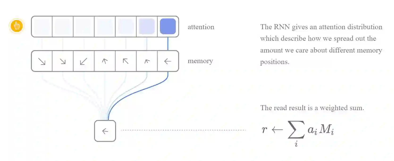 这类方法的关键在于将程序的行为可微分化。我们知道程序的行为是离散的,每一次指令都是读出或者写入一个存储(比如寄存器,内存等)。只有让离散的行为可微分化,才能利用 back propagation 去训练模型。NTM 巧妙的利用了 [attention][distll] 机制将 RNN 模型和外部的存储阵列连接起来。每次的输入和输出操作都连接到所有的地址,而每个连接都有一个权重(weight)来决定它的有效性。每次输出的结果可以看作是输入和权重的运算,而权重则可以通过网路训练得到。因此,计算机的离散行为就(通过 attention 机制等)转换成了连续的可微分化操作。沿着这类思路的工作还有 [3] 和 [2] 等。