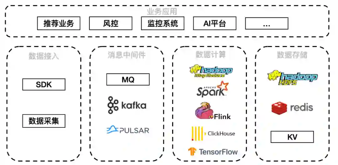 微信的业务场景包括推荐业务、风控、监控系统、AI 平台等。数据通过 SDK 和数据采集方式接入,经由 MQ、Kafka、Pulsar 消息中间件,其中 Pulsar 发挥了很大的作用。中间件下游接入数据计算层 Hadoop、Spark、Flink、ClickHouse、TensorFlow 等计算平台,由于本次介绍实时推荐场景,因此较多使用 Flink 和 TensorFlow。落地存储平台则包括 HDFS、HBase、Redis 以及各类自研 KV。