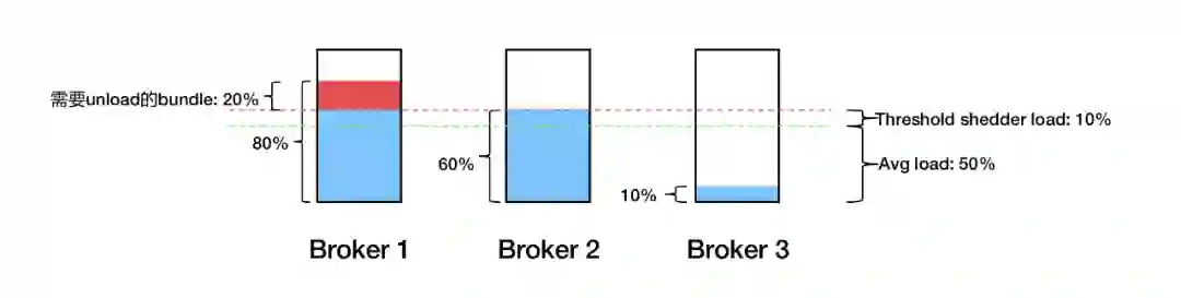 如上图,假设三个 Broker 平均负载是 50%,则阈值就是 60%,超出 60% 的部分需要均衡。但实际应用中发现 Broker 1 的多余 20% 负载会卸载到 Broker 2 上,之后由于 Broker 2 超载所以又会卸载下来,还会回到 Broker 1 上。结果流量就在 Broker 1 和 Broker 2 上反复横跳。