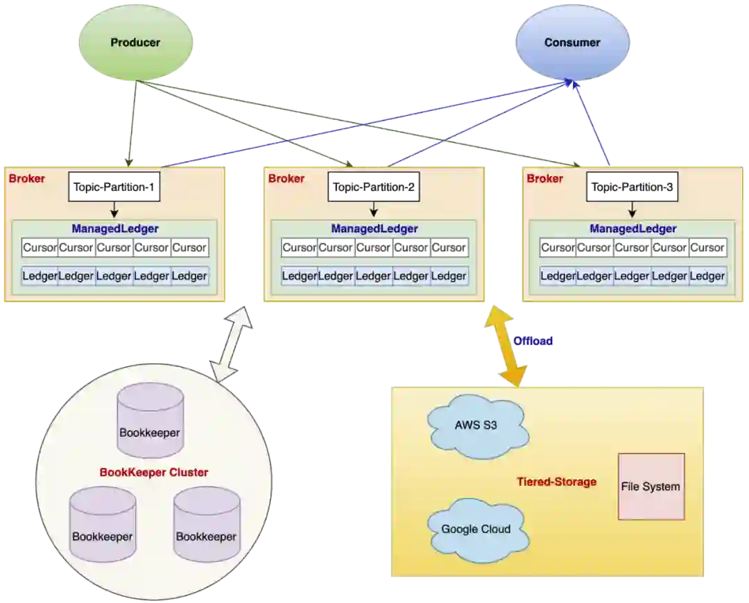 Pulsar 提供了分层存储能力,可以将存储转移到廉价的存储层。Pulsar Offloader 可以将超过一定时长的 Ledger 搬运到远端存储,不再停留在 Bookie 层,由 Broker 接管这部分的数据管理。