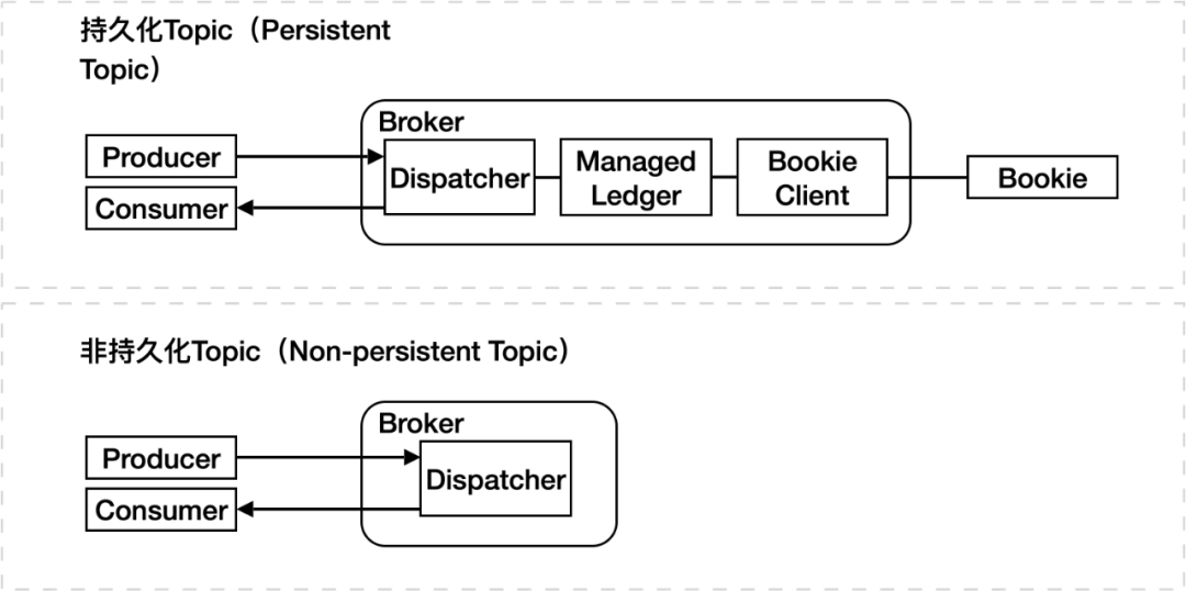 生产者和消费者是同 Broker 中的 Dispatcher 模块交互的,而持久化 Topic 中生产者数据会通过 Dispatcher 进入 Managed Ledger 模块,再调用 Bookie 客户端与 Bookie 交互。非持久化 Topic 中数据不会进入 Managed Ledger,而是直接发送给消费者。在大流量场景中,非持久化 Topic 由于不需要与 Bookie 交互,对集群的带宽压力会明显降低。