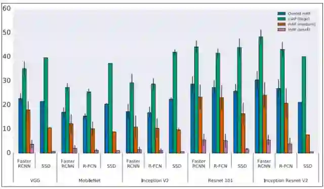 注意:Y 轴表示的是平均准确率(mAP),X 轴表示不同元架构(meta-architecture)的各种特征提取器(VGG、MobileNet...Inception ResNet V2)。此外,mAP small、medium 和 large 分别表示对小型、中型和大型目标的检测平均准确率。即准确率是按「目标尺寸、元架构和特征提取器」进行分层的,并且图像的分辨率固定为 300。虽然 Faster R-CNN 在上述样本中表现得更好,但是这并没有什么价值,因为该元架构相比 R-FCN 来说慢得多。