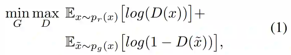 生成器 G:R^d_z→R^n 和判别器 D:R^n→R 之间的博弈可以被形式化定义为如下的极大极小目标: