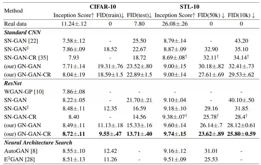 Inception Score(IS) 和 Frechet Inception Distance(FID) 是两种流行的评测生成模型的指标。研究者用它们对 GN 进行定量评测。为了公平比较,所有的评价结果都是通过 IS 和 FID 的官方实现计算的。为了与之前没有严格遵循标准评价协议的工作进行比较,本文的评价是根据几种计算 FID 的不同设置来设计的。此外,他们还保留了在整个训练过程中的最佳模型,并报告了平均性能。