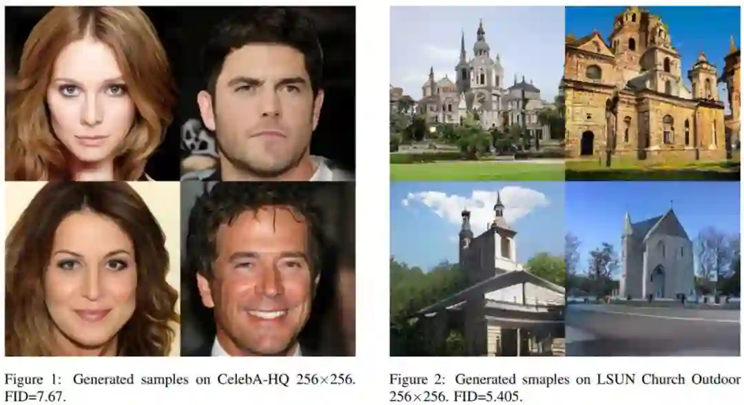 此外,研究者还在 CelebA-HQ、LSUN Church Outdoor 这两个具有较高分辨率的数据集上测试了梯度归一化方法。CelebA-HQ 包含 3 万张尺寸为 (256 × 256 × 3) 的人脸图像;LSUN Church Outdoor 是 LSUN 数据集的一个子集,包含 12.6 万张尺寸为 (256 × 256 × 3) 的教堂外景图。