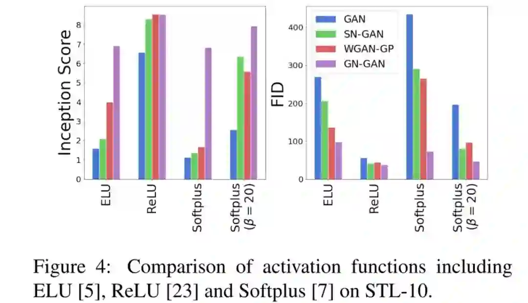 下图 4 显示了具有不同激活函数的 GAN、WGAN-GP、SN-GAN、GN-GAN 的 IS、FID 指标,说明 GN 在 ELU 和 ReLU 激活函数上取得了最佳的得分。并且在 Softplus(β = 20) 激活函数上得到了不错的得分 。值得注意的是,在 β 增大时,Softplus 与 ReLU 趋同。因此,GN 在 Softplus(β = 20) 上的性能优于 Softplus。