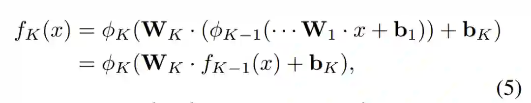 其中,W_K∈R^d_K×d_K-1 以及 b_K∈R^d_K 是第 K 层的参数,d_K 是第 K 层的目标维度,φ_K 是第 K 层的元素级的非线性激活函数。f_K,∀k ∈ {1 · · · K} 代表前 K 层组成的子网络。